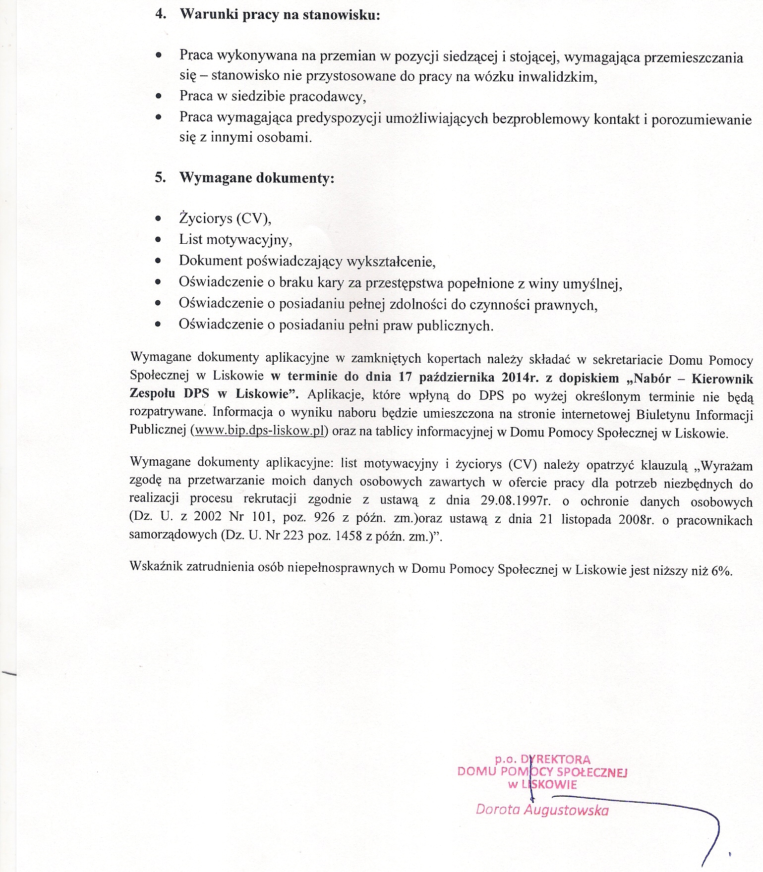 Ogłoszenie o naborze na wolne kierownicze urzędnicze stanowisko pracy Kierownika zespołu Domu Pomocy Społecznej w Liskowie