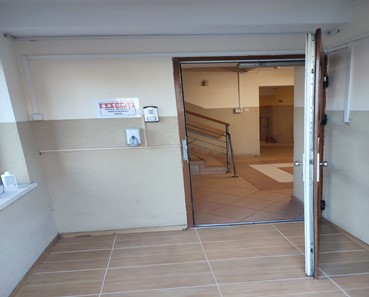 Po wejściu do budynku, przed drzwiami na ścianie znajduje się domofon.